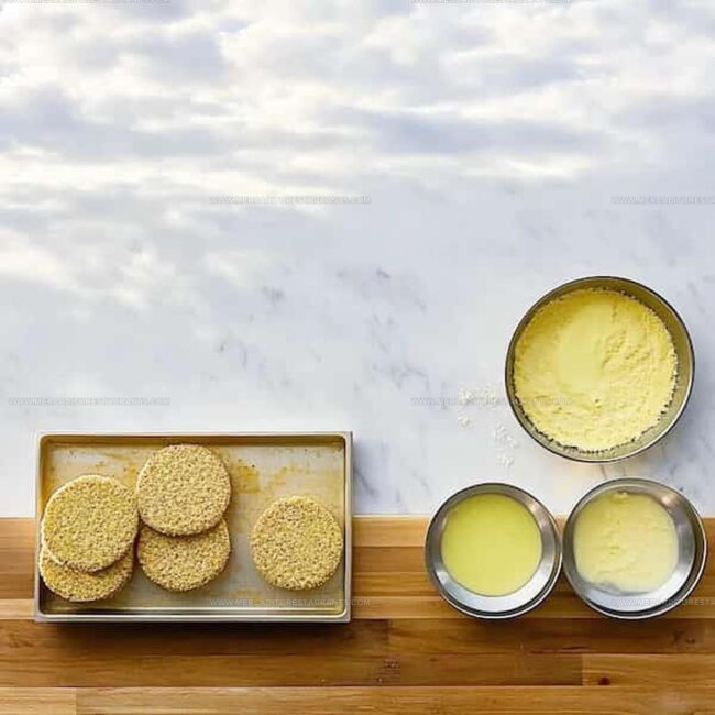 - Press the egg-coated slice into the breadcrumb mixture, coating both sides thoroughly.