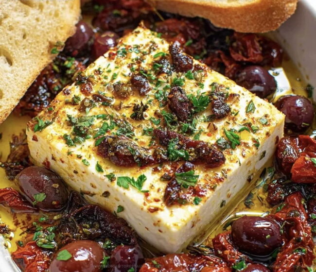 - Carefully arrange 1 cup of pitted olives and ½ cup sun-dried tomatoes around the feta, creating a colorful and flavorful landscape.