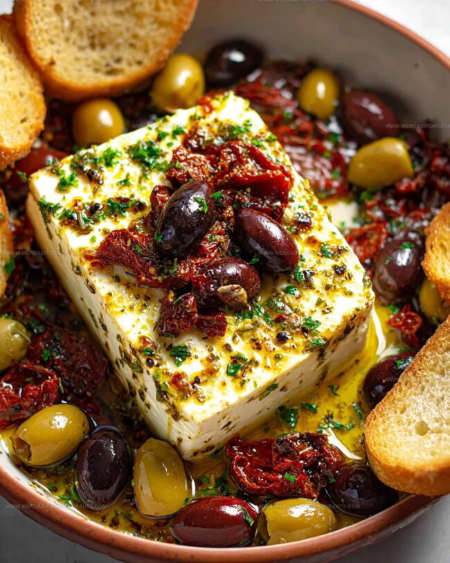 - Pour the herbed olive oil mixture evenly over the feta, olives, and sun-dried tomatoes, ensuring every ingredient gets a delicious coating.