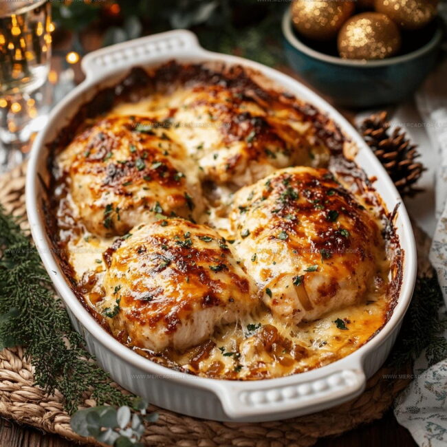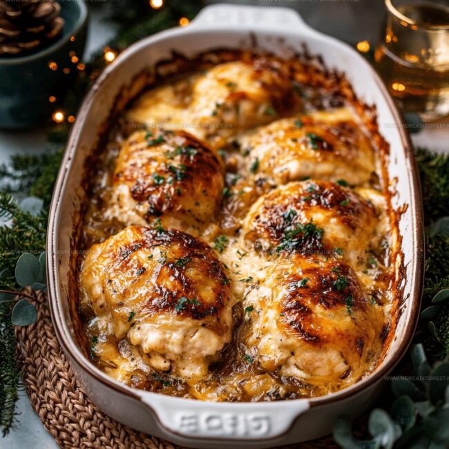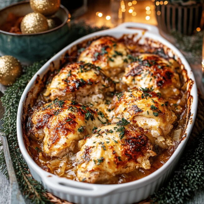 Simmering French onion chicken bake brings comfort straight to your dinner table with caramelized onions and melted cheese blanketing tender chicken. Hearty flavors merge beautifully in this simple yet satisfying one-pan meal that makes weeknight cooking feel like a cozy restaurant experience.