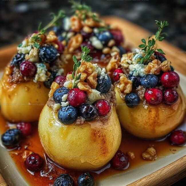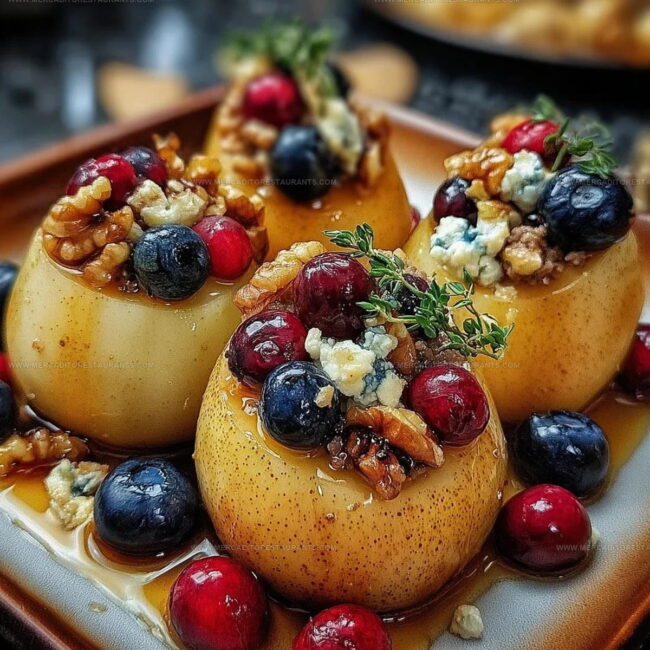 Baked pears with berries honey walnuts and blue cheese deliver a stunning combination of sweet and savory flavors that feels both elegant and comforting.