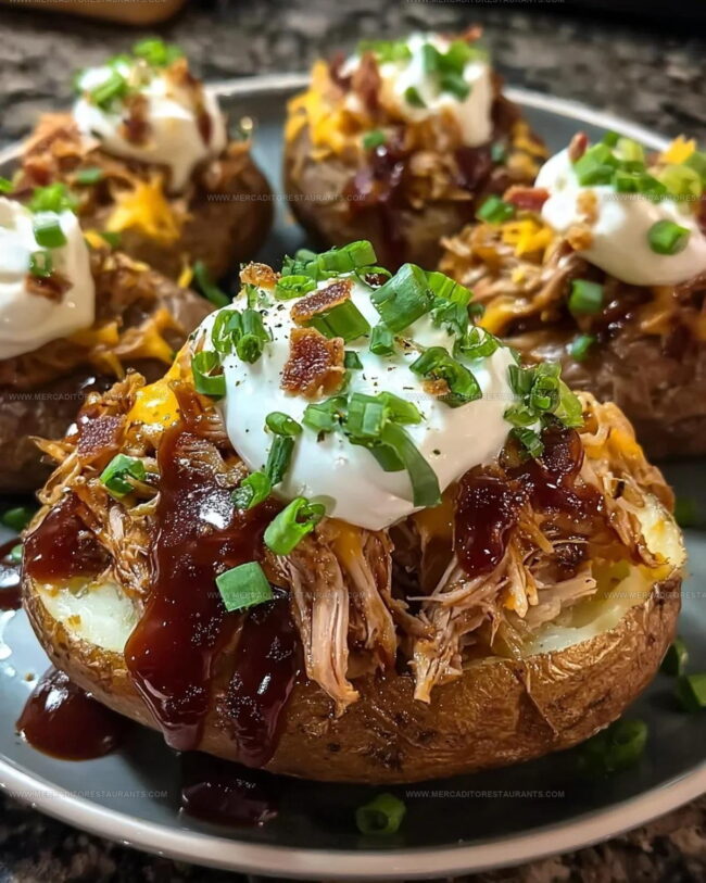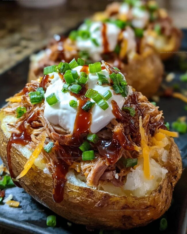 Succulent pulled pork transforms the classic loaded baked potato into a mouthwatering feast that satisfies serious comfort food cravings.