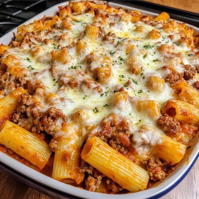 Cheesy beef rigatoni bake delivers comfort straight from your kitchen, bringing hearty pasta and rich meat together in one satisfying pan. Melted cheese blankets tender rigatoni and seasoned ground beef, creating a dinner that’ll make your family crowd around the table with smiles.