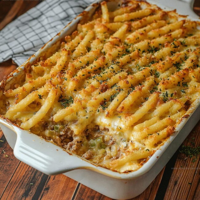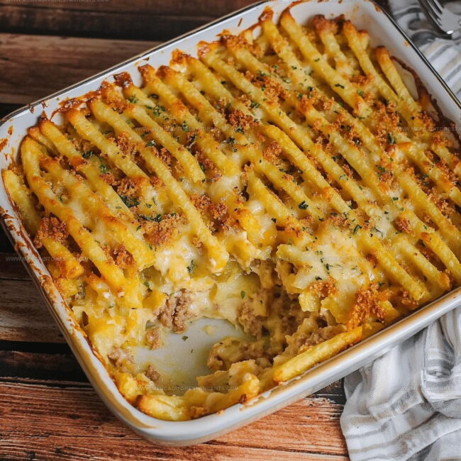 Slide the dish into the preheated oven and bake uncovered for 30-35 minutes. You’re looking for crispy fries and bubbling cheese.