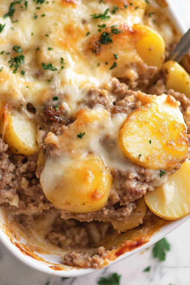 - Create a second layer with remaining potato slices, then top with remaining beef mixture.