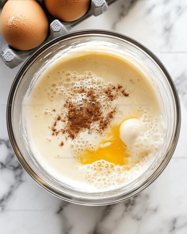 - Grab a large mixing bowl and whisk together 3 cups whole milk, 1 can sweetened condensed milk, 1 teaspoon vanilla extract, ½ teaspoon cinnamon, ¼ teaspoon nutmeg, and ¼ teaspoon salt.