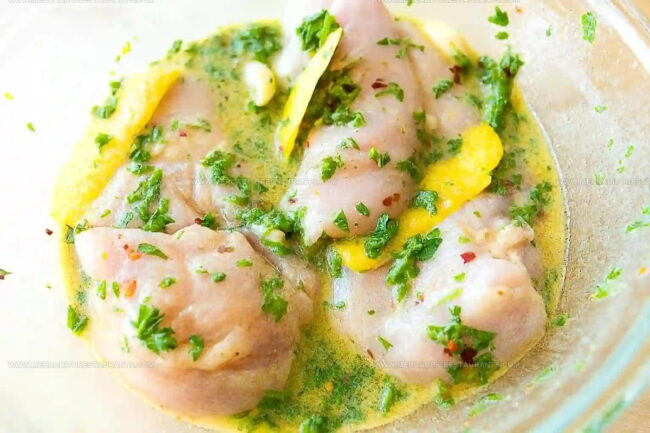 The combination of fresh lemon juice, olive oil, mustard, and herbs creates a bright, tangy flavor that perfectly tenderizes your chicken without overpowering it.