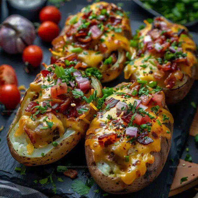 Crafted loaded baked potatoes deliver pure comfort straight from your kitchen, packed with crispy bacon, melted cheese, and a dollop of sour cream that makes dinner feel like a warm hug. Served piping hot, these potatoes bring classic flavors together in a simple yet satisfying meal your family will absolutely devour.