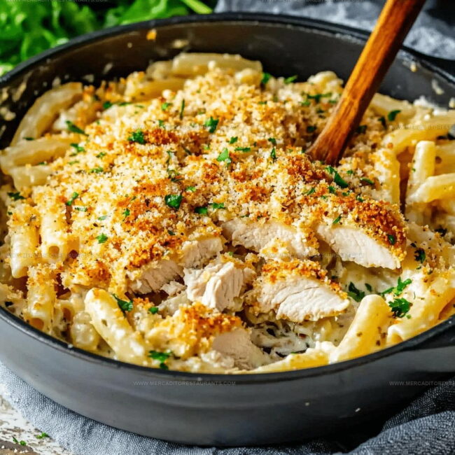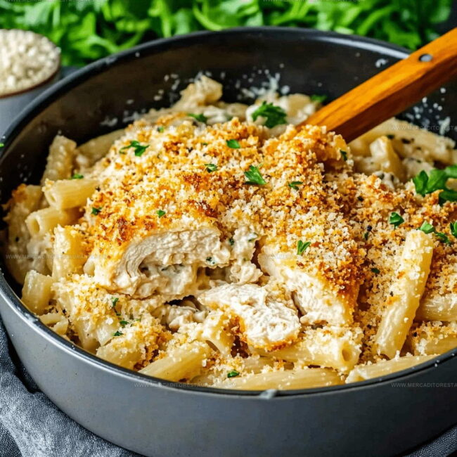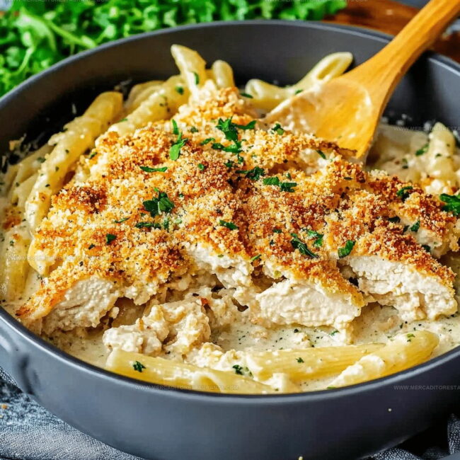 This dish transforms the classic breaded chicken into a comforting pasta casserole, keeping the signature garlic butter and crispy breadcrumb elements while making it easier to serve for a crowd.