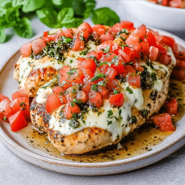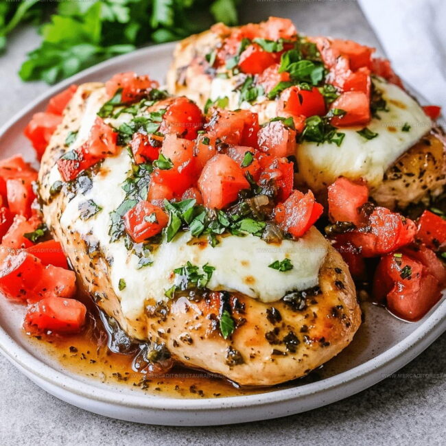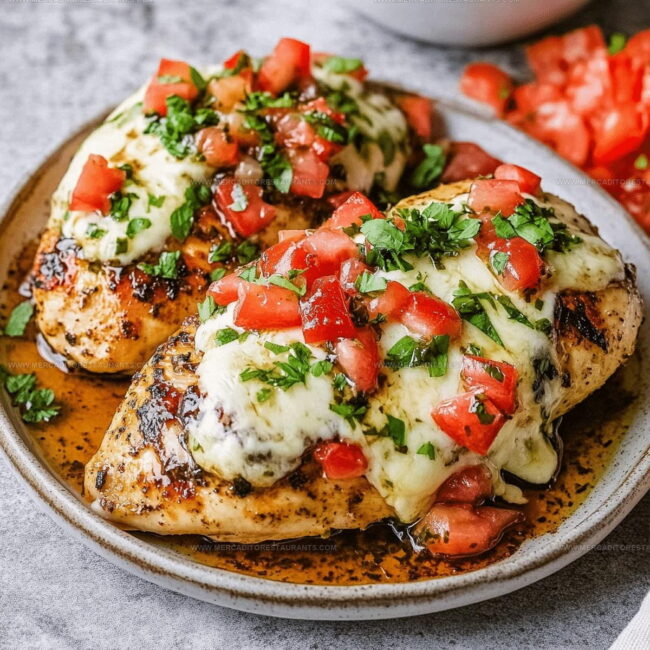 - Layer 2-3 fresh Roma tomato slices and 2 oz mozzarella on top of each chicken breast.