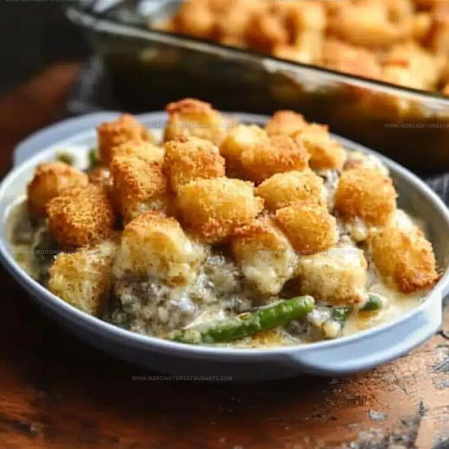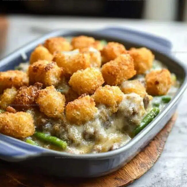 Green Bean Casserole with Tater Tots brings comfort directly to your dinner table, blending crispy potato goodness with classic green bean warmth. Creamy, cheesy, and topped with crunchy tots, this crowd-pleasing dish delivers pure satisfaction in one easy-to-love casserole.