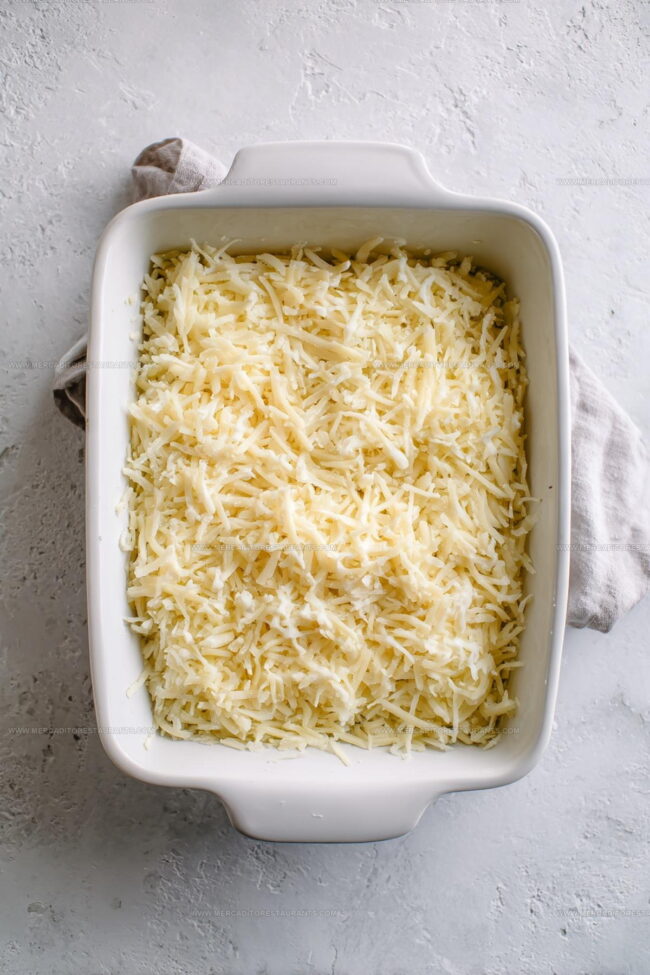 Transfer the hash brown blend into your prepared baking dish. Use a spatula to smooth out the top, creating an even surface that will bake perfectly.