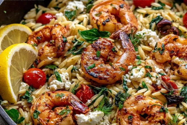 Lemon feta orzo roasted shrimp combines Mediterranean flavors that promise pure summer comfort.