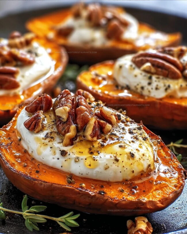- Drizzle the warm maple Dijon butter evenly over the sweet potatoes and burrata. Sprinkle ¼ cup chopped toasted walnuts across the dish.