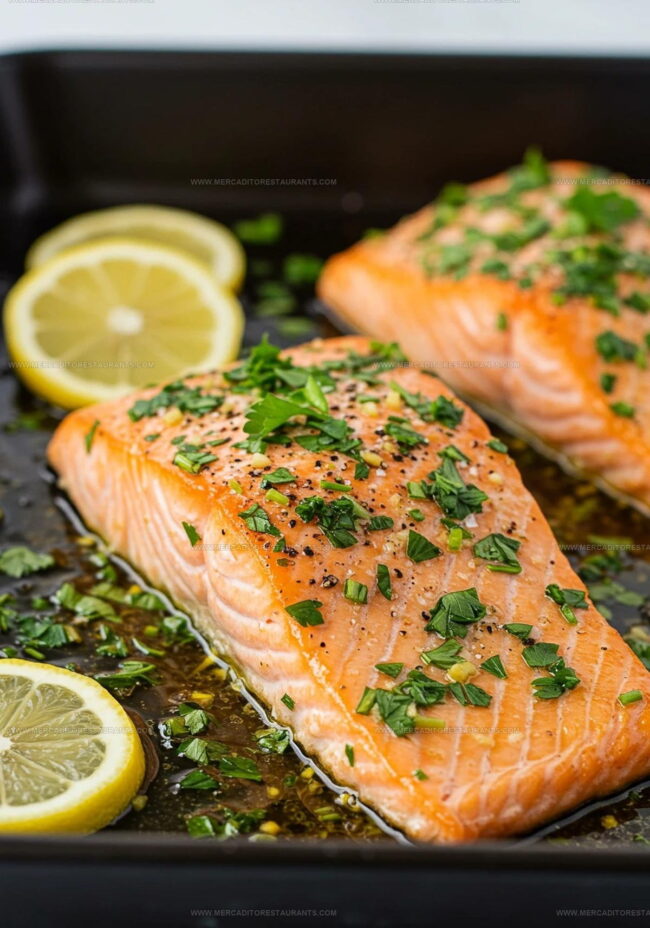 - Remove salmon from oven. Sprinkle fresh chopped parsley across the top for a bright, herbal finish. Serve immediately while the fish is warm and fragrant.