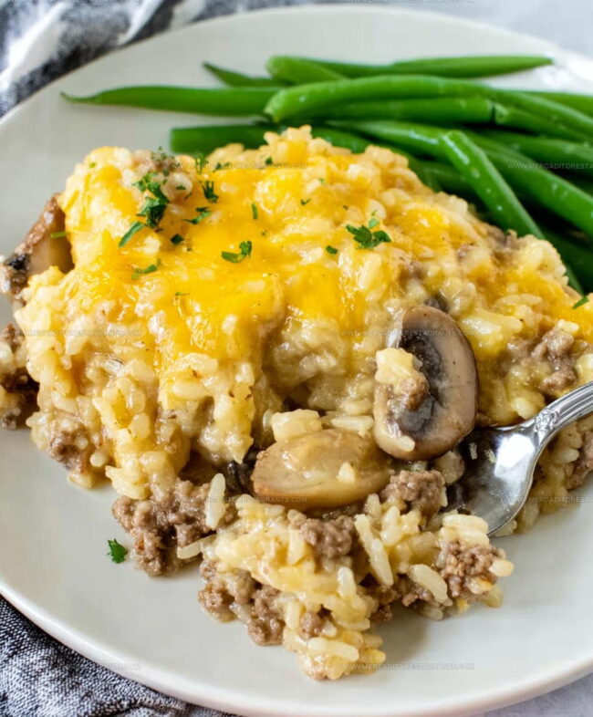 Cheesy ground beef and rice casserole has earned its place as a weeknight dinner hero that busy families count on time and again.