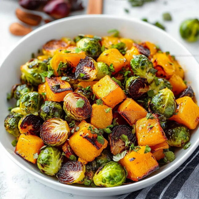 Roasted butternut squash and Brussels sprouts make a stunning combination that feels like autumn on a plate.