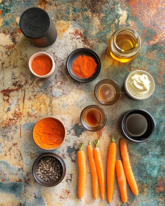 Crank your oven to 425F. Grab a baking sheet and line it with parchment paper. Wash and peel 1.5 lbs of carrots, then slice them in half lengthwise. Here’s what you’ll toss them with: