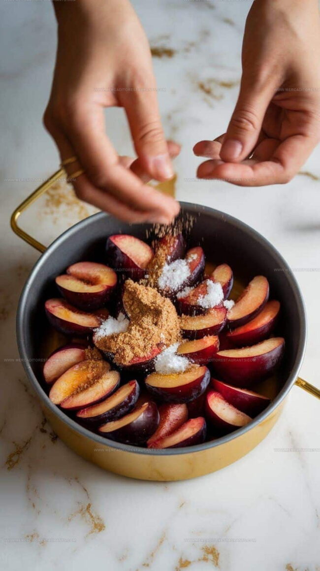 - Gently fold the plums to distribute the seasonings without breaking the fruit pieces.