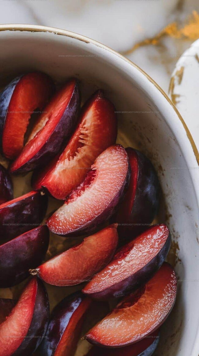 - Cut 1 ½ lbs ripe plums into even wedges and arrange them in a single layer within a ceramic baking dish.