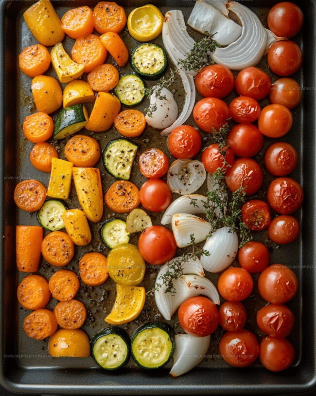 - Preheat your oven to a searing 425°F (220°C). Spread out the chopped carrots, onions, squash, zucchini, and cherry tomatoes across a large baking sheet.