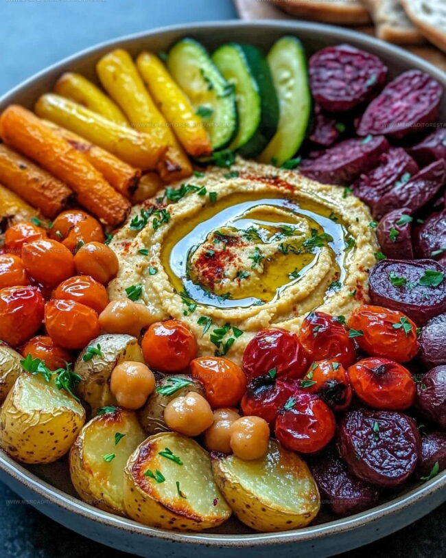 Grab a large bowl and spread a generous cup of hummus right in the center. Carefully arrange your roasted vegetables around the hummus in beautiful color-blocked sections.