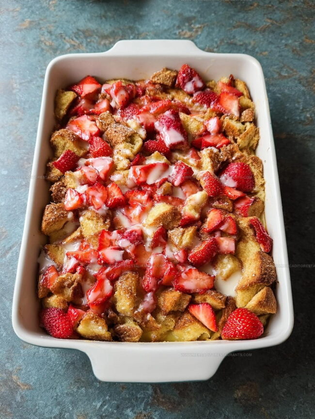 After pulling the casserole from the oven, let it rest for 10 minutes. This helps it set up and makes cutting easier. Serve warm and add any extra toppings you like – whipped cream, maple syrup, or extra fresh strawberries work great!