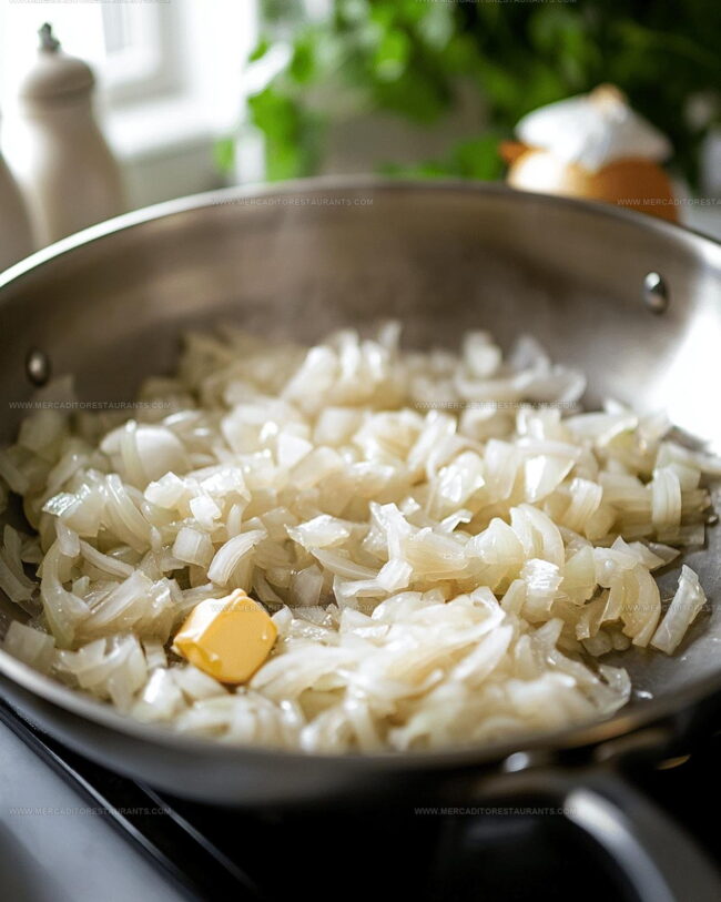 - Melt ¼ cup unsalted butter in a large skillet at medium heat. Sauté 1 diced yellow onion for 3-4 minutes until softened.