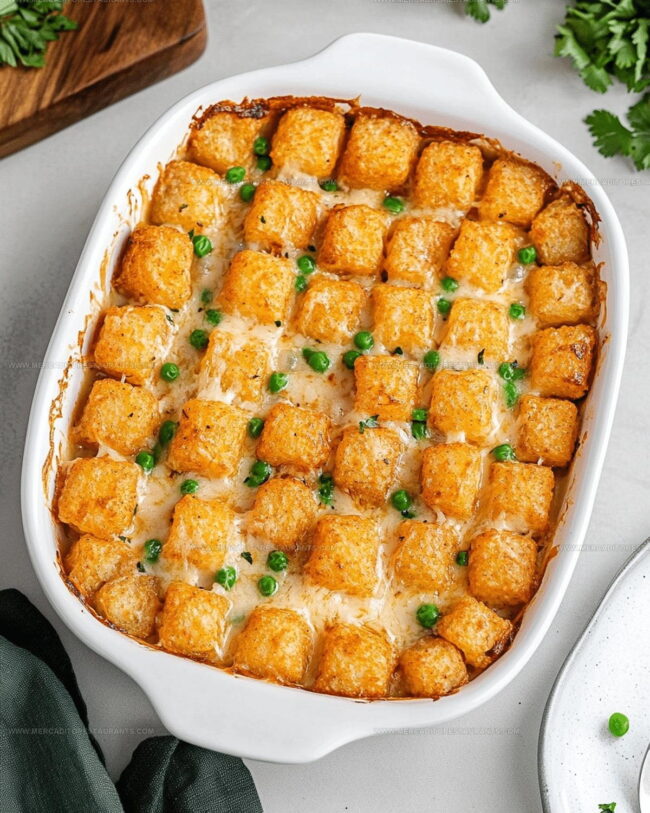 Tater tot chicken pot pie brings pure comfort right to your dinner table, blending crispy potato crowns with creamy chicken filling that warms you from the inside out. Hearty, simple, and totally satisfying, this dish turns weeknight dinners into something special.