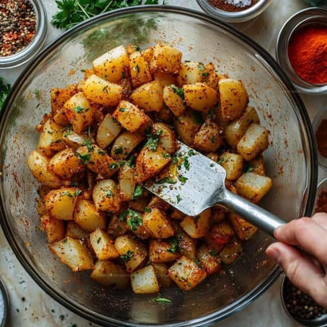- Gently fold seasonings into potatoes using a silicone spatula, ensuring each chunk receives an even coating.